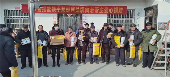 “這是在安徽金搖藍(lán)公司工作的老官莊村人王北領(lǐng)、王建立攜手萊那珂奶粉企業(yè)慰問鄉(xiāng)親們吶!”武金英老人一臉幸福。據(jù)悉,這次慰問的對(duì)象是老官莊貧困戶、60歲以上老人及困難群眾,慰問捐贈(zèng)的禮品為奶粉240桶,價(jià)值十萬余元。同時(shí),老官莊新當(dāng)選地村黨支部書記王杰華也出資5000元,為村里的60歲以上老人及困難群眾購買大米120袋,用行動(dòng)為老官莊老人送去節(jié)日的祝福。