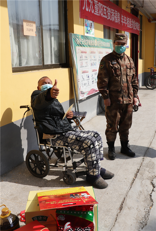 新橋鎮(zhèn)新兵楊凱入伍前和癱瘓的父親相依為命,市人武部領(lǐng)導(dǎo)協(xié)調(diào)地方政府,把其父親送到了新橋鎮(zhèn)敬老院公費養(yǎng)老,解除他的后顧之憂。春節(jié)到了,人武部領(lǐng)導(dǎo)還牽掛著這個特困家庭,矯百成帶隊來到新橋鎮(zhèn)敬老院。此時正值中午,楊凱的父親正坐在屋外的輪椅上曬太陽,見到矯部長的突然到來,激動的眼含熱淚,他緊緊握住矯百成的手久久不愿松開。矯百成噓寒問暖,給他送上1000元慰問金和生活必需品,楊凱的父親用他那不太清晰的語言表達對部長的真誠感謝。在敬老院院長的帶領(lǐng)下,矯百成又來到老人的住室察看起居情況,詢問他平時生活狀況,當?shù)弥先松畹暮苁娣r,矯百成滿意的笑了。