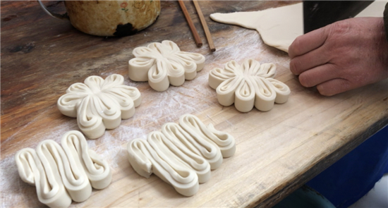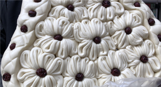 除了平常的白面饅頭,黃師傅還讓妻子現(xiàn)場展示了“棗山”制作,并介紹了棗山的寓意和習(xí)俗。“你看這棗山是一層一層的,寓意著步步登高,而且棗山的花形是圓的,代表著團團圓圓。過去出嫁的閨女過年回娘家要帶大饃,娘家要回棗山,現(xiàn)在咱們周口的一些地方還保留著這樣的習(xí)俗。”兩位主播體驗了棗山的制作過程,得到黃老板妻子的夸獎:“中!這倆妮兒可巧!”
