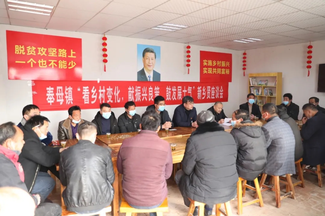 匯聚眾人之力才是發(fā)展之力,凝聚眾人智慧才是最高智慧。春節(jié)之際,奉母鎮(zhèn)黨委為進(jìn)一步調(diào)動鄉(xiāng)賢的積極性和創(chuàng)造性,共同探討家鄉(xiāng)的發(fā)展與建設(shè),最大限度贏得鄉(xiāng)賢對家鄉(xiāng)發(fā)展的支持和反哺,有效推動資金回流、項(xiàng)目回歸、信息回傳、人才回鄉(xiāng),集發(fā)展“錦囊妙計(jì)”,匯聚助推鄉(xiāng)村振興的新力量,特意把七二村的“看鄉(xiāng)村變化,獻(xiàn)振興良策,鼓發(fā)展士氣”新鄉(xiāng)賢座談會會場布置到“鄉(xiāng)村大食堂”。奉母鎮(zhèn)黨委書記陳鵬、武裝部長胡波濤參加座談會。陳鵬作了講話。