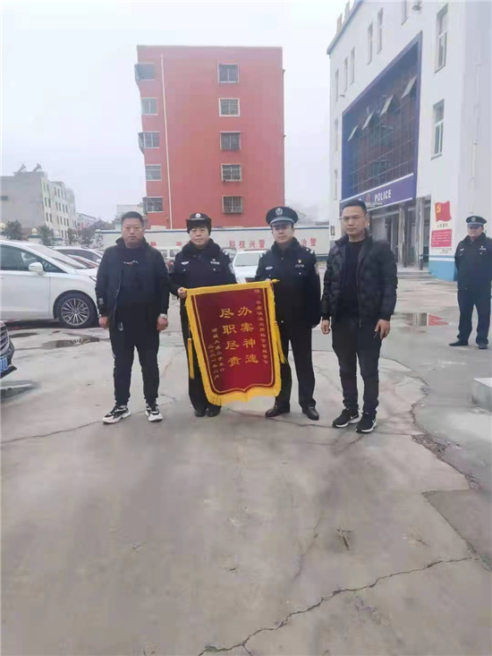 2月25日上午,項城市公安局水寨派出所門口鑼鼓齊鳴,異常熱鬧,兩名男子手持一面寫有“辦案神速、盡職盡責”字樣的錦旗,送給派出所民警,深表謝意。
