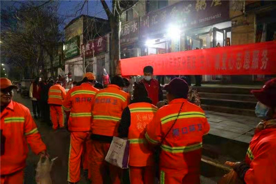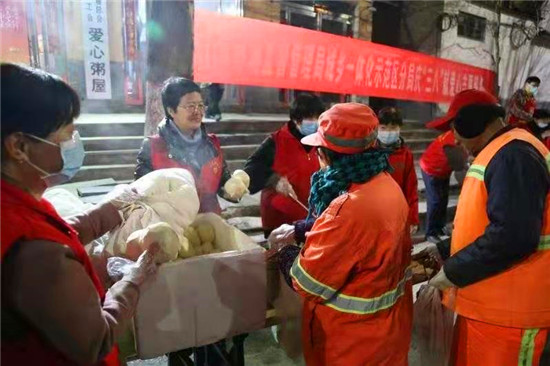 當(dāng)日早上5時(shí),在愛心粥屋里,示范區(qū)分局的志愿者們穿著紅馬甲,戴上口罩,立即進(jìn)入忙碌狀態(tài),大家既分工明確又相互配合,現(xiàn)場(chǎng)井然有序。他們?yōu)榄h(huán)衛(wèi)工人盛飯端菜,拿雞蛋饅頭,動(dòng)作迅速,熱情周到,有條不紊,個(gè)個(gè)忙得不亦樂乎。在這個(gè)清冷的早晨,因?yàn)橛辛藷釟怛v騰的飯菜和志愿者忙碌的身影,環(huán)衛(wèi)工人開心地笑容,感受到濃濃暖意。