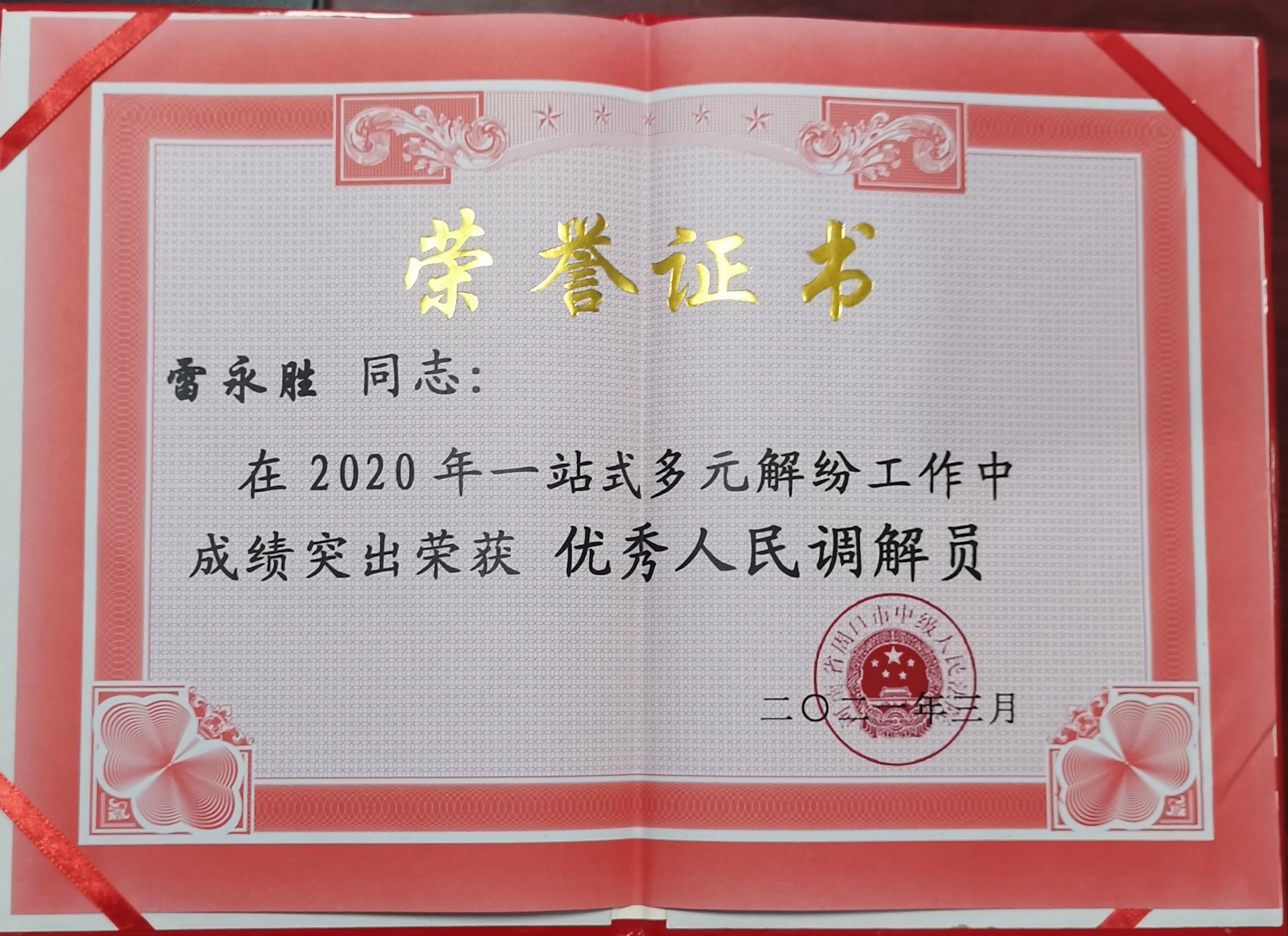 自2020年5月以來,雷永勝調(diào)解員已累計接受各類案件近200件,成功調(diào)解近百件,助力法院訴前調(diào)解工作邁入先進(jìn)行列,化解了大量社會矛盾,為維護(hù)社會和諧穩(wěn)定作出了積極貢獻(xiàn)。日前,雷永勝被周口市中級法院評為“2020年度優(yōu)秀人民調(diào)解員”。