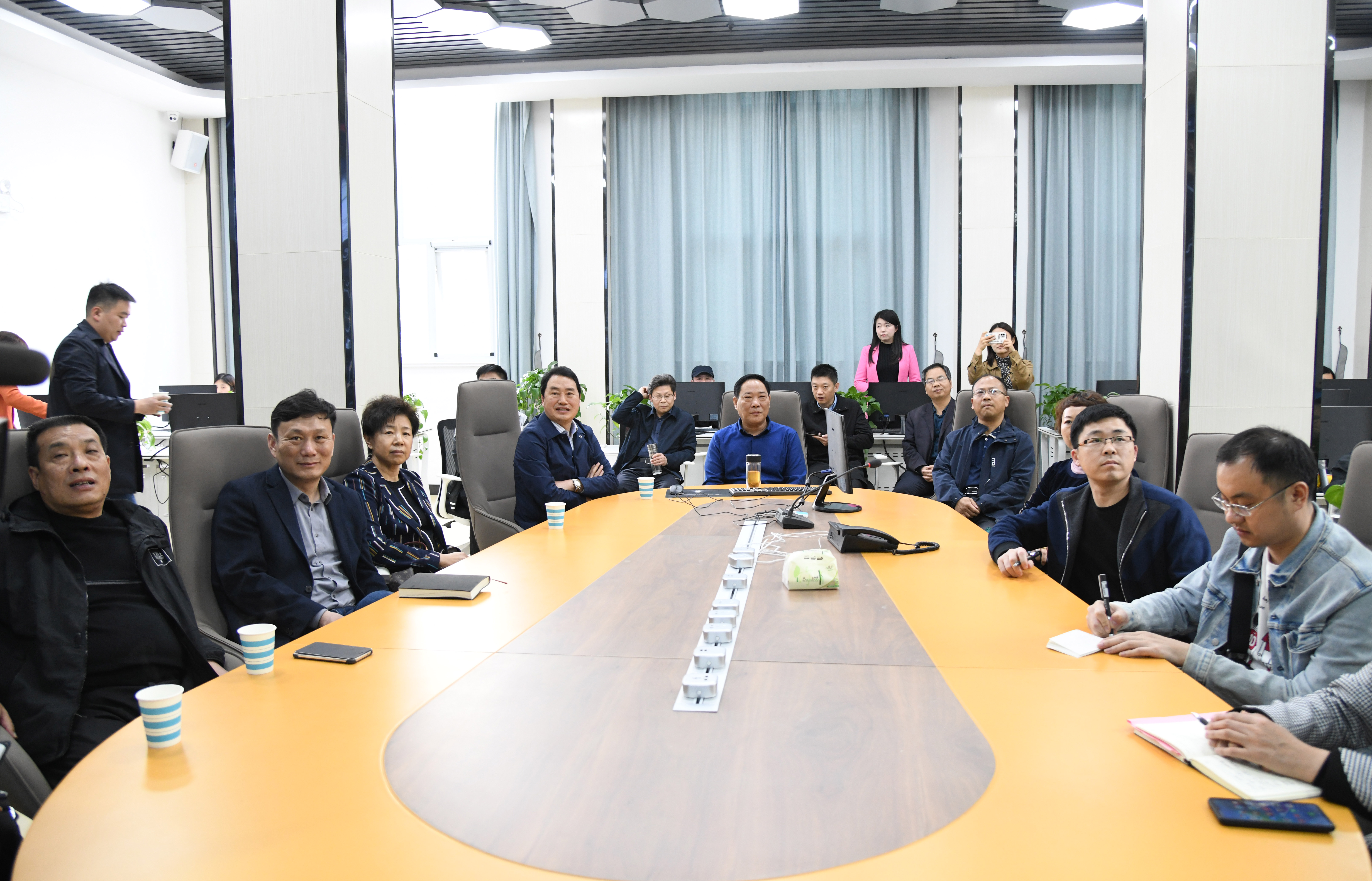 圖為:開(kāi)封日?qǐng)?bào)報(bào)業(yè)集團(tuán)一行在參觀周口報(bào)業(yè)融媒體演播室