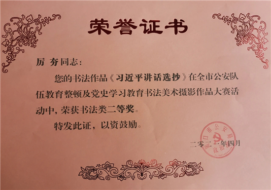 本次大賽,我市民輔警積極參加,踴躍報送,選送書法、美術、攝影作品30余件。其中扶溝縣公安局宣傳科李龍喜、交警大隊厲夯等人的書法《初心忠誠聯(lián)》《習近平講話選抄》等作品分別榮獲書法類一等獎、二等獎;扶溝縣公安局宣傳科閆曉鳳等人的攝影作品《晨讀》、《走訪話安全》等分別榮獲攝影類二等獎、三等獎。此次大賽,全面筑牢了民輔警忠誠履職的思想根基,切實把教育整頓及黨史學習教育活動的成果轉(zhuǎn)化為思想成果和工作成果。充分展示了扶溝公安堅定的理想信念和良好的精神風貌。②9