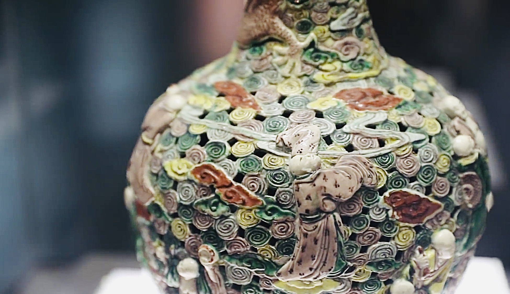 我是五彩透雕十八羅漢云龍瓶,又名古瓷流韻天球瓶。靜謐的空間里,我站在周口市博物館的玻璃展柜里,瞅瞅四周的兄弟姐妹,我偷偷笑了。雖沒有長睫毛和雙眼皮,但我可是個十足的“混血兒”。技藝精湛、圖案華貴、色彩艷麗,我的稀有性和珍貴性常常讓來訪者驚嘆不已。和青花瓷相比,我更加瑰麗多彩,人稱文物界的“米蘭·可兒”。