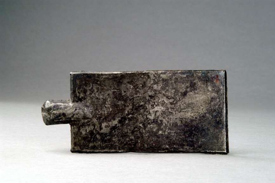 在周口市博物館展廳中,陳列著一件楚國實(shí)首方肩銀布幣,它呈長方形鏟狀,長13.6cm,寬6.2cm,短柄,實(shí)首,灰白色,保存完好,為國家一級(jí)文物。