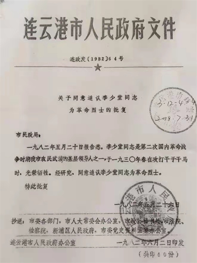 新中國(guó)成立后,李少堂的孫子才聯(lián)系上了李少堂曾經(jīng)的革命戰(zhàn)友惠浴宇同志。時(shí)任江蘇省省長(zhǎng)的惠浴宇同志得知消息后,親寫證明遞交黨中央,這才證實(shí)了李少堂的身份。