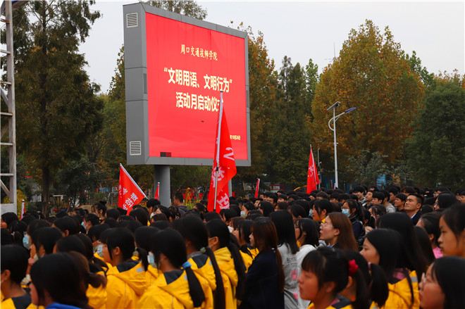 “我是周口交通技師學(xué)院的一名學(xué)生,從今天起,我要講禮儀、懂禮貌、不說臟話……積極參加“文明用語、文明行為”主題實(shí)踐活動(dòng),爭(zhēng)做文明學(xué)生?!?0月26日,周口交通技師學(xué)院全體師生在學(xué)院“文明用語、文明行為”活動(dòng)月動(dòng)員會(huì)上集體宣誓。師生們堅(jiān)定的目光和錚錚的誓言,展現(xiàn)出青年學(xué)子講文明話、辦文明事、做文明人的堅(jiān)定決心。