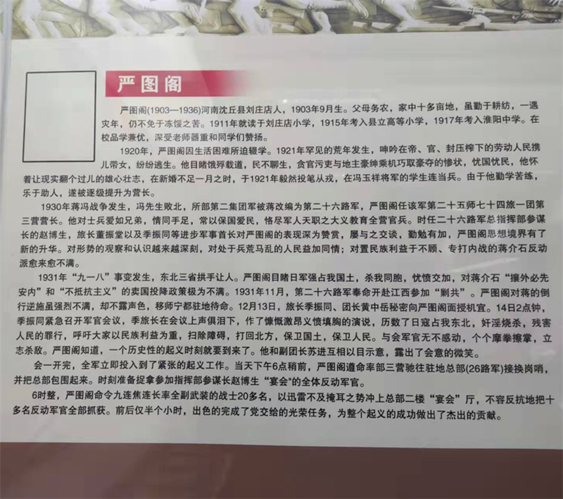 嚴圖閣出生于1903年,河南省沈丘縣人。1911年,嚴圖閣被父親送進劉莊店小學讀書,1915年考入縣立高等小學,1917年投考淮陽中學被錄取。他刻苦讀書,成績優(yōu)異,深得老師和同學們的贊揚。1921年,他毅然背井離鄉(xiāng),外出從軍。1930年,嚴圖閣任國民革命軍第二十六路軍一團三營營長。1931年12月,參加著名的寧都起義,成為中國共產(chǎn)黨領(lǐng)導(dǎo)的革命隊伍中的一員。寧都起義后,嚴圖閣所在部隊改編為紅軍第五軍團,由于其驍勇善戰(zhàn),累積戰(zhàn)功,被任命為第十六師參謀長。1932年,嚴圖閣正式加入中國共產(chǎn)黨。1935年在湖北一場戰(zhàn)斗中身負重傷,后轉(zhuǎn)移至湖南省平江縣治療。1936年3月,嚴圖閣奉命擔任湘鄂贛省軍區(qū)司令員職務(wù),進行游擊戰(zhàn)爭,為保衛(wèi)湘鄂贛革命根據(jù)地作出了貢獻。1936年11月,嚴圖閣因病不幸去世。