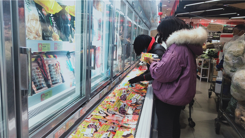 2月15日是元宵節(jié),湯圓占據(jù)中心城區(qū)各大超市的熱銷C位,各式袋裝湯圓擺滿冰柜。