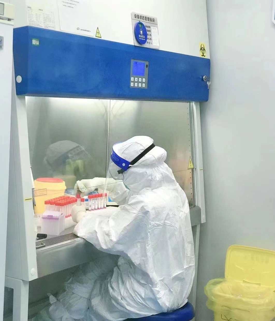 實驗室的三級防護包括穿著連體防護服,戴N95口罩、雙層手套、鞋套和護目鏡。由于核酸檢測不同于其他檢測,PCR 實驗室里機器不間斷運行,即使開著空調(diào),室內(nèi)溫度也有27℃~28℃。密不透風的防護裝備一穿就是6個小時~8個小時,感染風險大、操作過程長,每次結(jié)束工作,姜等等渾身都會被汗水浸透。核酸提取、體系配制、擴增檢測……每道程序背后,都充滿了高風險。接收的樣本有鼻咽拭子,鼻咽拭子直接震蕩混勻處理,取一定量到核酸提取板,提取完成,加一定量提取液到透明的八聯(lián)管內(nèi),每一步都要做到無一缺漏。