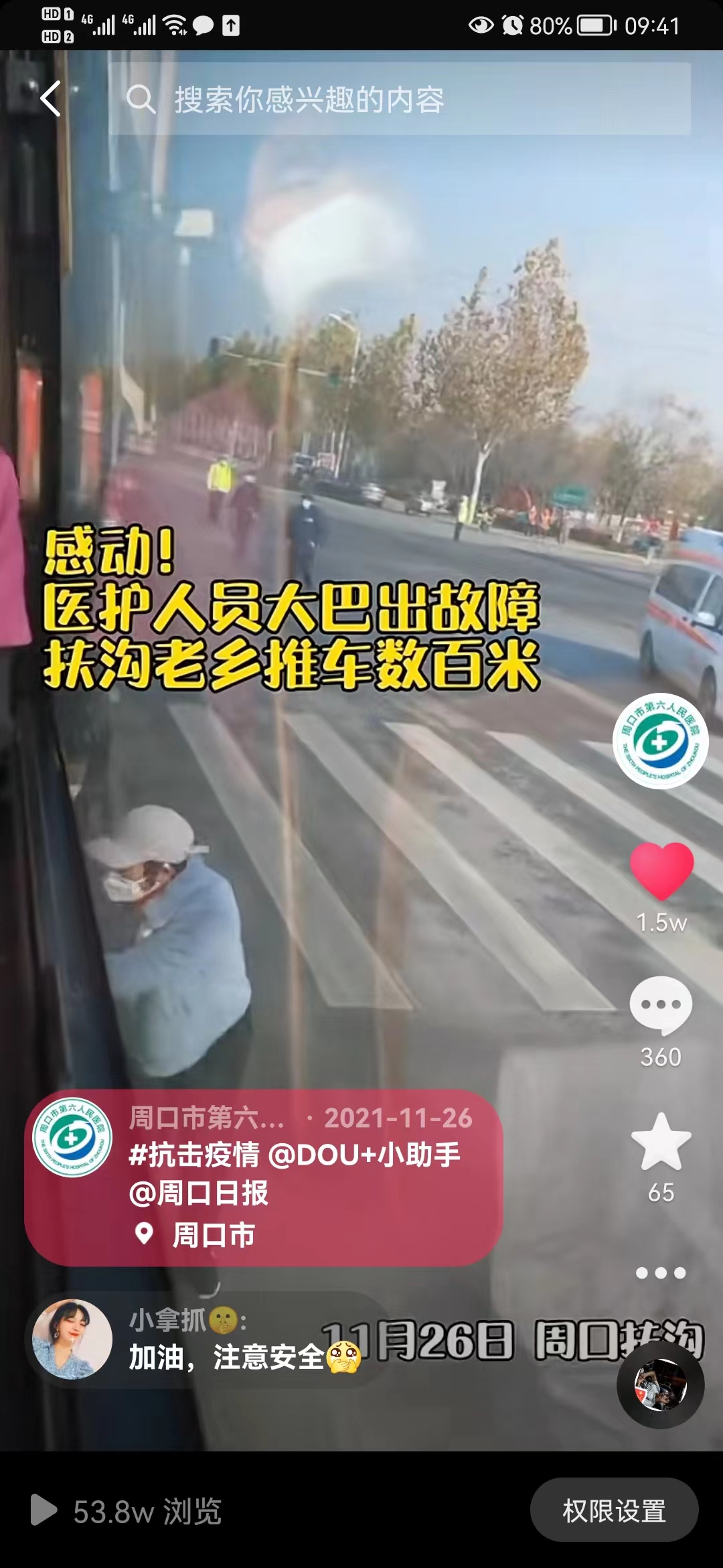 回去的時候,楊妮她們坐的大巴車出了故障,沒辦法正常啟動,扶溝鄉(xiāng)親們,親自推車數(shù)百米,幫助她們的大巴啟動。她坐在車上非常感動,用手機記下了這一幕,在后來醫(yī)院的宣傳中,這條段視頻被點擊了50多萬次,收獲了1萬多人的點贊。