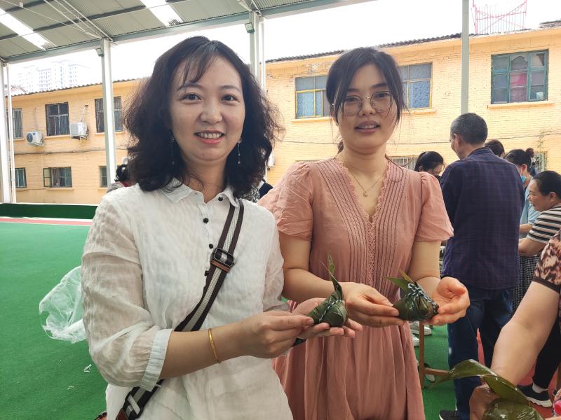 “雖然我平常很少包粽子,但還是挺簡單的?!蔽乃蓮?qiáng)邊說邊包,用繩子將粽子纏繞好,用牙咬住繩子的一頭,一手拿粽子,另一手將繩子打結(jié)。整個過程一氣呵成,引來不少人前來學(xué)習(xí)。