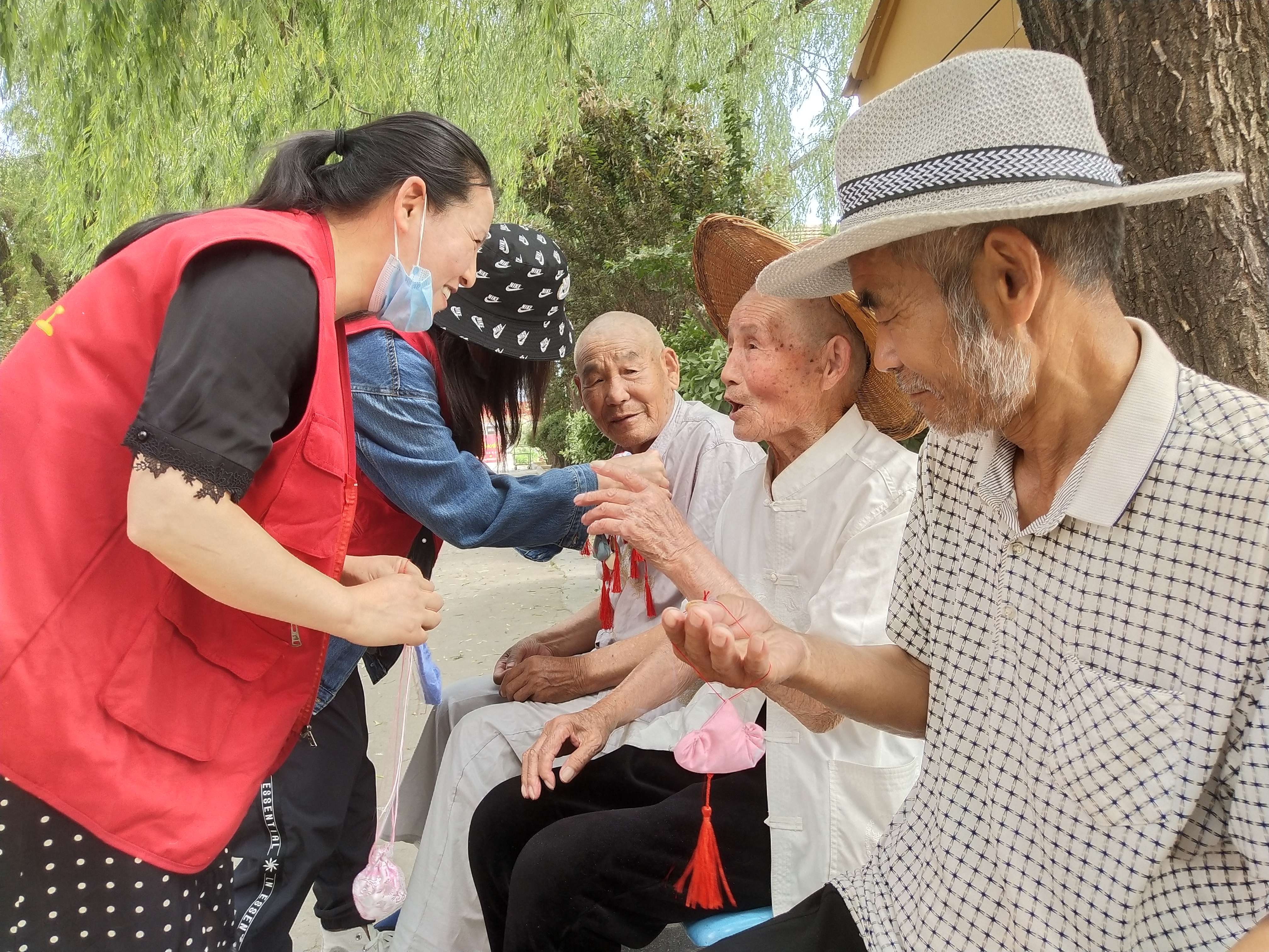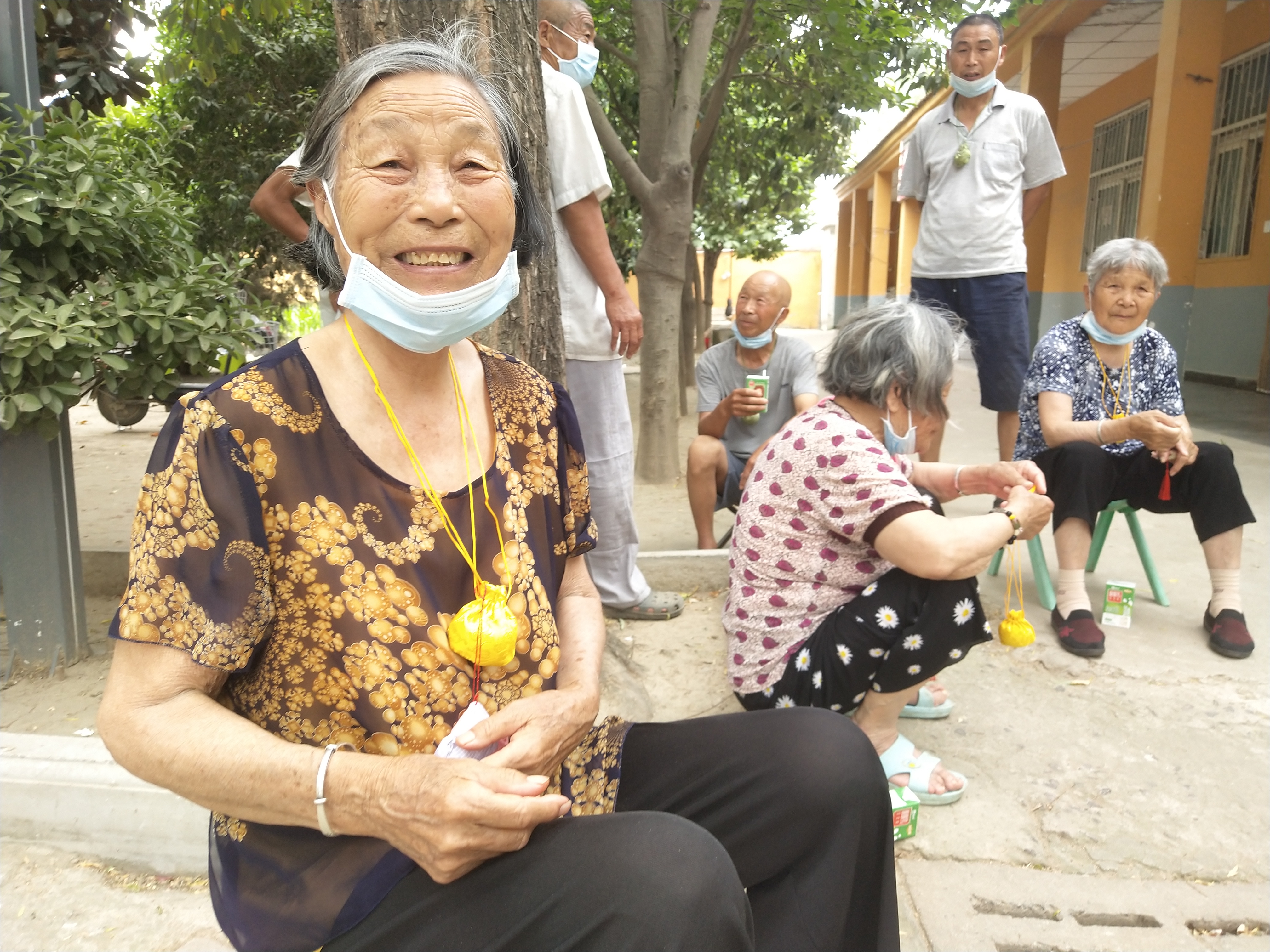 “來,來,來,這是玉英從江蘇省南通市給咱郵寄過來的香包,今天過節(jié)哩,大家每人帶上一個,祝愿大家胸前飄香,端午安康!”