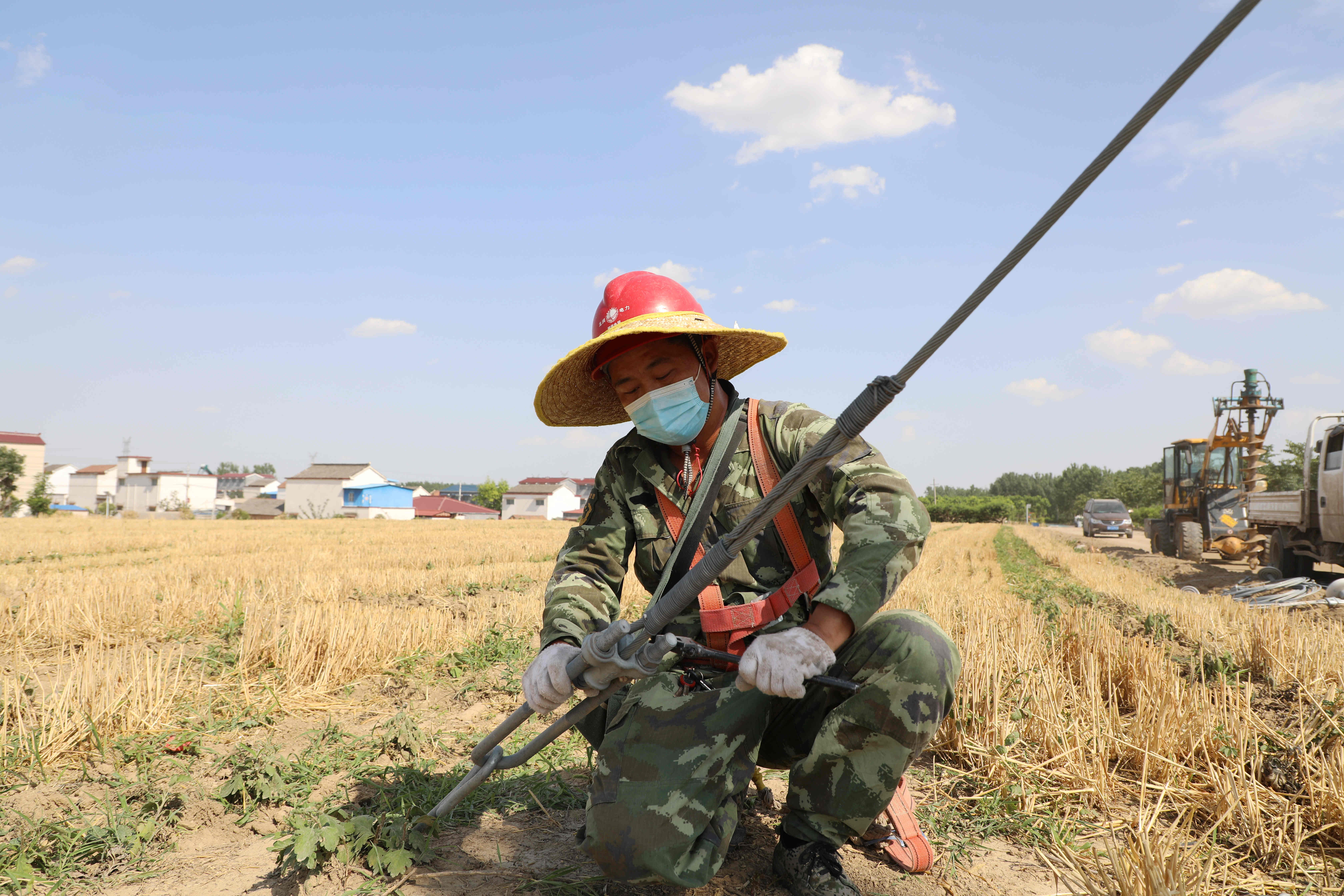 6月13日11時,天氣格外晴朗,烈日下氣溫突破38攝氏度。西華縣黃橋鄉(xiāng)潁河河堤上一片忙碌的景象,該縣供電公司搶修人員正在烈日下緊張有序地忙活著。
