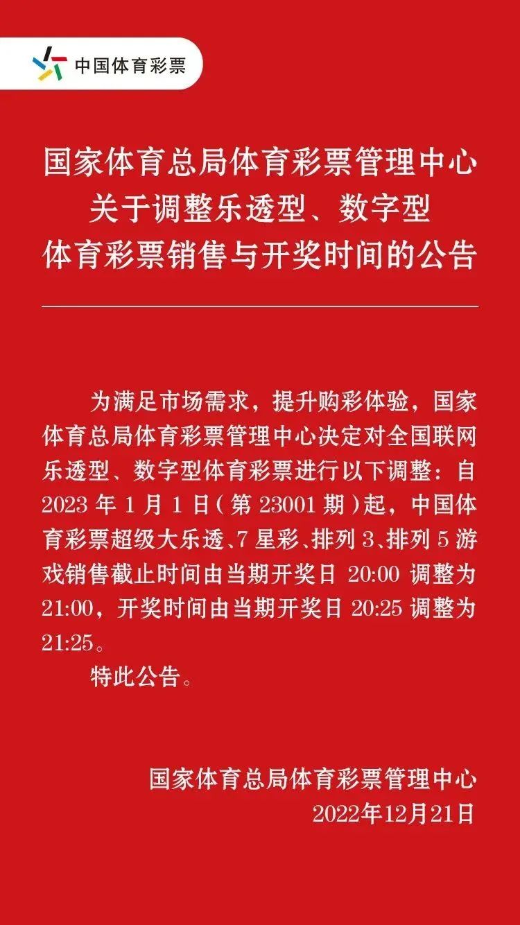 1月1日(第23001期)起,大樂透、7星彩、排列3、排列5游戲銷售截止時間由當(dāng)期開獎日20:00調(diào)整為21:00,開獎時間由當(dāng)期開獎日20:25調(diào)整為21:25。購彩者可通過電視、廣播、網(wǎng)站、手機客戶端、報紙等渠道查閱開獎信息。