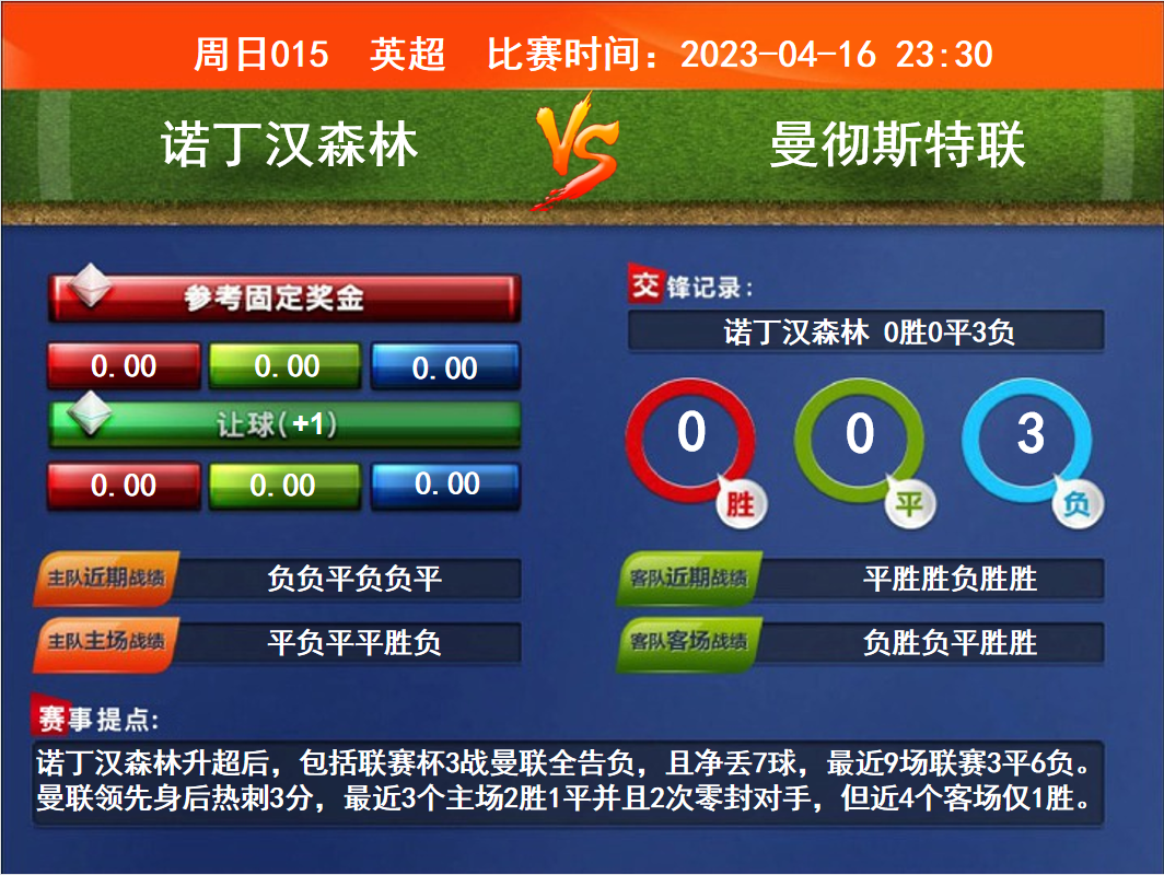 比賽時間:2023-04-16 23:30賽事提點:諾丁漢森林升超后,包括聯(lián)賽杯3戰(zhàn)曼聯(lián)全告負,且凈丟7球,最近9場聯(lián)賽3平6負。曼聯(lián)領先身后熱刺3分,最近3個主場2勝1平并且2次零封對手,但近4個客場僅1勝。