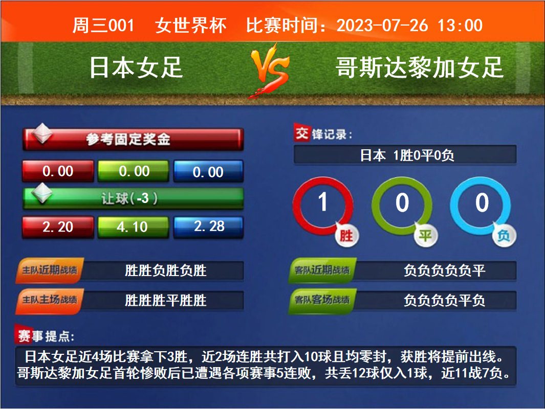 周三001 女世界杯 日本女足VS哥斯達(dá)黎加女足