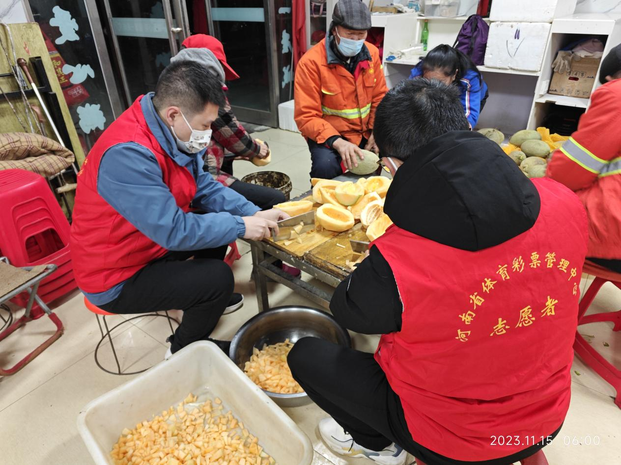 11月16日凌晨5時(shí),周口體彩分中心志愿者還到“東方愛(ài)心粥屋”開(kāi)展志愿服務(wù)活動(dòng),幫助粥屋工作人員洗菜、切菜、炒菜、熬粥。