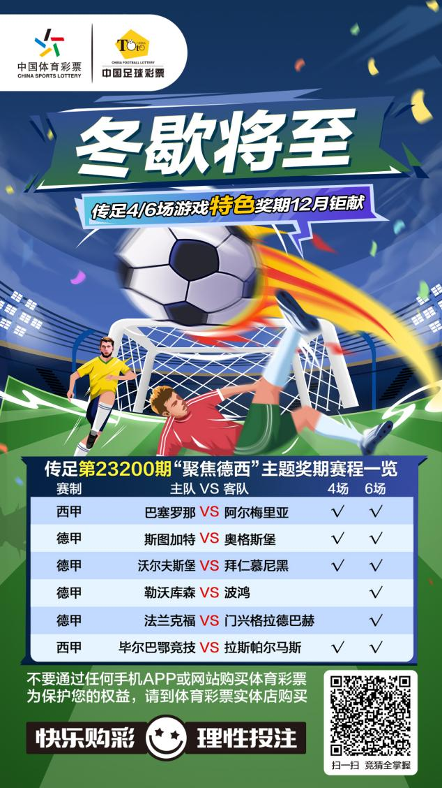 第23200期傳足特色獎期已經(jīng)于12月17日20:00開售,將于12月20日22:00停售,并于12月21日開獎。其中沃爾夫斯堡VS拜仁慕尼黑、斯圖加特VS奧格斯堡、巴塞羅那VS阿爾梅里亞和畢爾巴鄂競技VS拉斯帕爾馬斯為4場進球游戲競猜賽事。