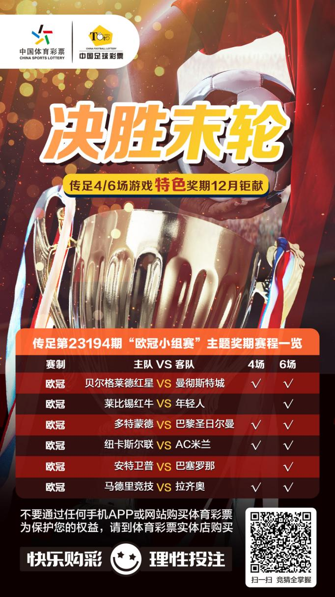 第23194期傳足特色獎(jiǎng)期已經(jīng)于12月10日20:00開售,將于12月13日22:00停售,并于12月14日開獎(jiǎng)。其中貝爾格萊德紅星VS曼徹斯特城、多特蒙德VS巴黎圣日爾曼、紐卡斯?fàn)柭?lián)VSAC米蘭和馬德里競技VS拉齊奧為4場進(jìn)球游戲競猜賽事。