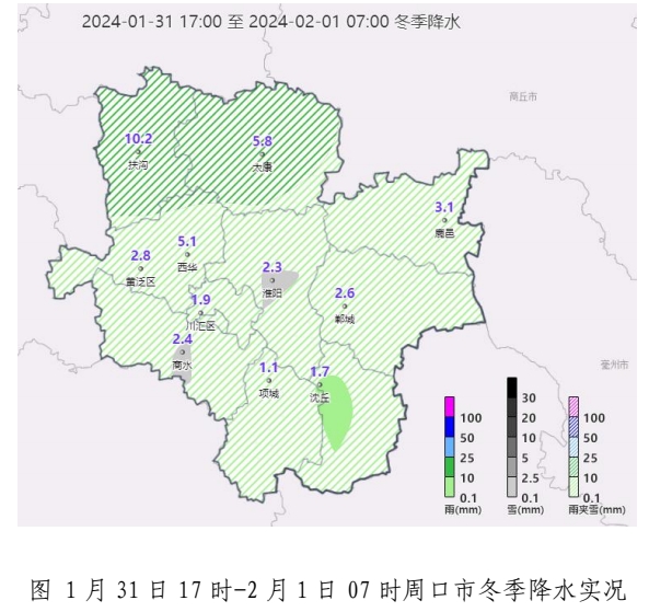 1月31日17時—2月1日7 時,我市出現(xiàn)小雨轉(zhuǎn)雨夾雪、北部地區(qū)中到大雪天氣。截止到1日7時。國家站累計雨雪量(毫米)為:扶溝10.2、太康5.8、西華5.1、鹿邑3.1、黃泛區(qū)2.8、鄲城 2.6、商水 2.4、淮陽 2.3、川匯區(qū) 1.9、沈丘1.7、項城1.1。各地區(qū)7時雪深(厘米):太康5、扶溝4、西華4、黃泛區(qū)1、鹿邑1。