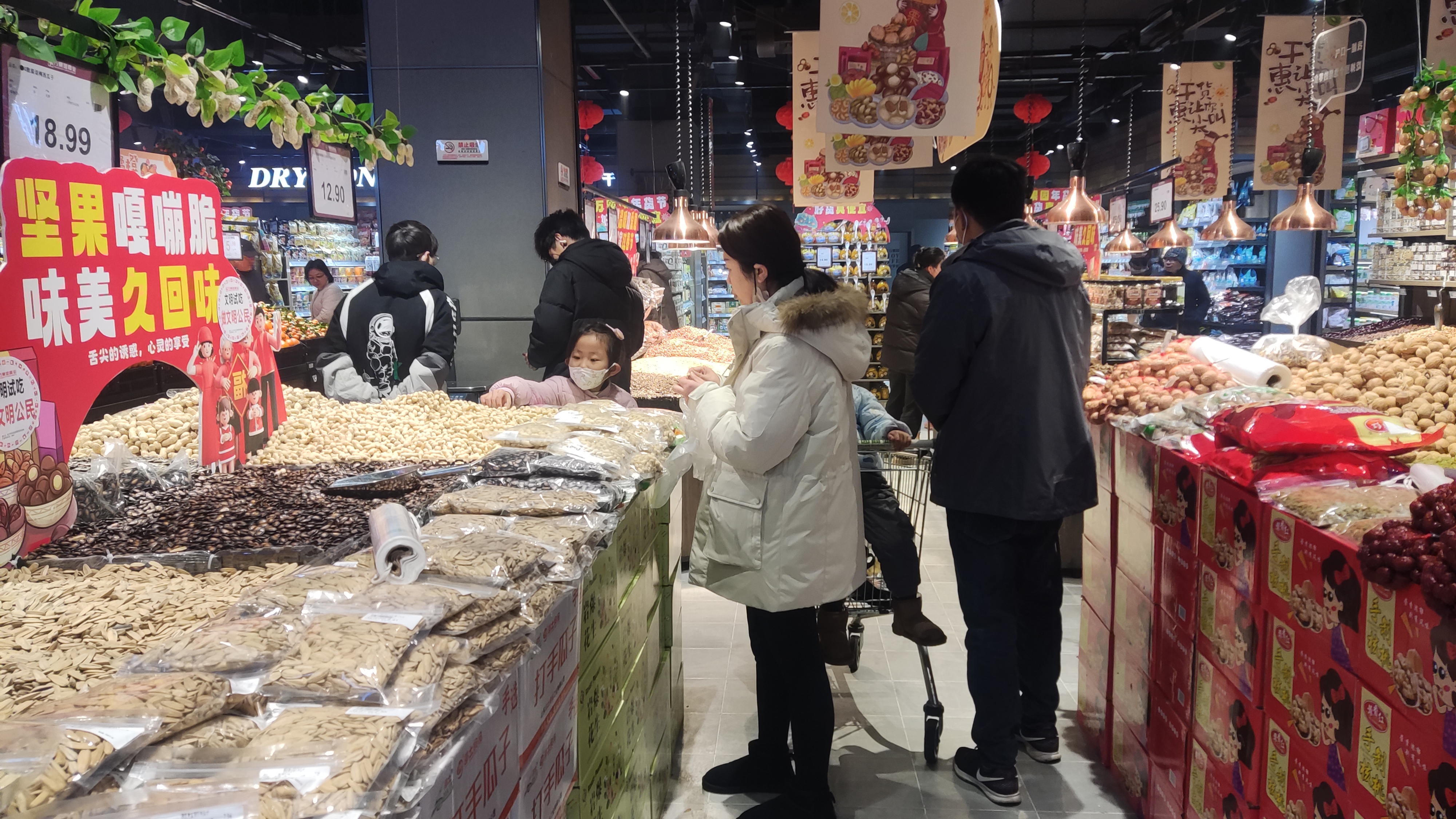 在中原路一家超市,各式各樣的堅(jiān)果吸引眾多消費(fèi)者購(gòu)買,從散裝到袋裝,再到禮盒裝,分類越來越細(xì)?!艾F(xiàn)在堅(jiān)果成了熱銷產(chǎn)品,開心果一天能賣幾百斤,碧根果、核桃的銷量也很可觀?!变N售人員告訴記者,為了應(yīng)對(duì)市場(chǎng)需求,超市新增了2個(gè)堅(jiān)果貨柜。