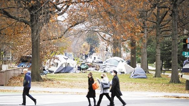 12月8日,在美國華盛頓,行人經(jīng)過無家可歸者居住的帳篷?!?a href="http://www.hnzudaojia.com/content/2021-12/11/content_962080.html" target="_blank" >[詳細(xì)]