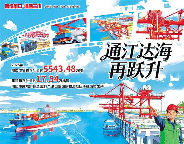 2025 年,周口港交出亮眼答卷:貨物吞吐量 5543.48 萬噸、集裝箱吞吐量 17.54 萬標(biāo)箱,兩項數(shù)據(jù)雙雙創(chuàng)下歷史紀(jì)錄,躋身全國 37 個港口型國家物流樞紐承載城市。