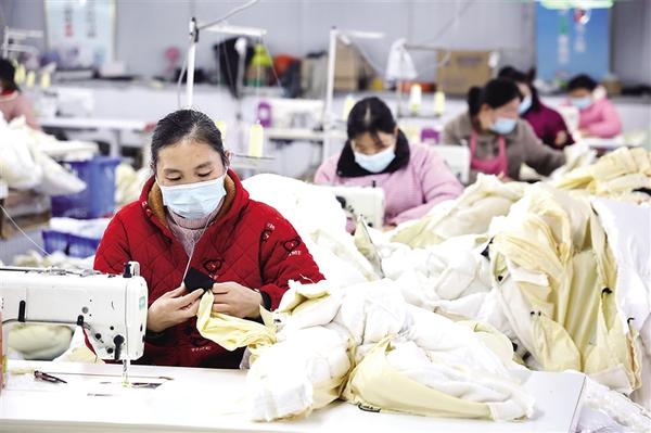 近年來,淮陽區(qū)四通鎮(zhèn)中營子村以黨建為核心引擎,筑牢基層戰(zhàn)斗堡壘,牽頭建起現(xiàn)代農(nóng)業(yè)服務(wù)合作社、種植合作社等,走出“黨組織搭臺(tái)、企業(yè)唱戲、群眾受益”的強(qiáng)村路徑。圖為村民在村辦服裝廠工作。