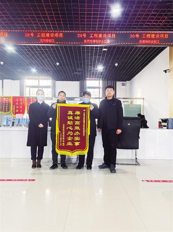 近日,太康縣某置業(yè)公司相關(guān)負(fù)責(zé)人將一面印有“廉潔高效辦實(shí)事 真誠貼心為企業(yè)”字樣的錦旗送到縣自然資源局,感謝工作人員為他們提供優(yōu)質(zhì)、高效、熱情的服務(wù)。