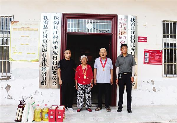 7月1日,扶溝縣委宣傳部駐江村鎮(zhèn)張龐行政村第一書記齊華中(左一)和村“兩委”干部走訪慰問該村兩位黨齡超過50年的黨員,為他們送去黨組織的關懷與溫暖。據(jù)了解,90歲的張秀真(左二),1957年入黨。76歲的劉學明(左三),1970年入黨。
