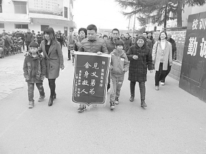 本報訊 (記者 朱紅 文/圖)3月7日本報以《姜振英:冰河救起雙胞胎》為題報道了沈丘縣縣直高中教師姜振英冰河勇救落水雙胞胎的英勇事跡。昨日上午,沈丘縣縣直高中鑼鼓喧天、格外熱鬧。在鑼鼓聲中,得救孩子和親屬一起將一面寫有“見義勇為 舍身救人”的錦旗送到姜振英手中。