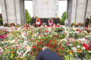 ?、?月9日,一名男子在德國(guó)柏林一處蘇軍烈士墓獻(xiàn)花。