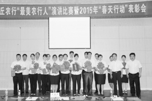 6月6日,沈丘農(nóng)行召開(kāi)“最美農(nóng)行人”演講比賽暨2015年“春天行動(dòng)”表彰大會(huì)。圖為獲獎(jiǎng)人員合影留念。(陳高翔 攝)