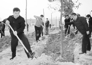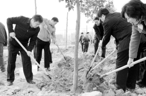 市委書記徐光等領(lǐng)導(dǎo)仔細(xì)培土。記者 王映 攝